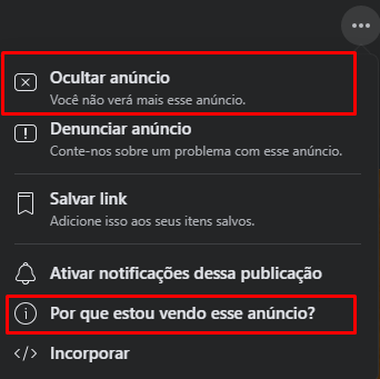 ). Você também pode ocultar um anúncio no facebook clicando nos três pontinho do lado superior direito do anúncios e depois clicando em “ocultar anúncio”. ou então ir em “por que estou vendo este anúncio e escolher a opção de não exibir mais informações daquele anunciante.